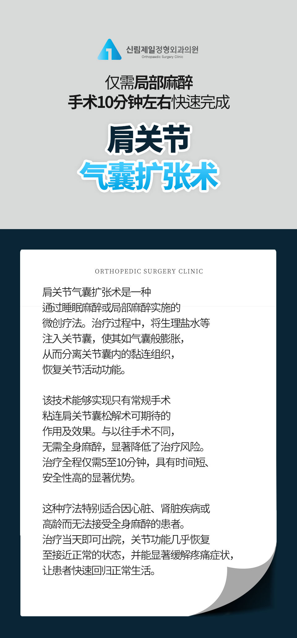 肩周炎,又称粘连性肩关节囊炎,是一种无明显诱因引发的肩部疼痛,疼痛程度严重,甚至持续约两年之久。 今后,不用再因夜间疼痛而辗转难眠,也无需因肩部不适而放弃高尔夫等喜爱的运动了。本院采用肩关节扩张疗法,通过将肩关节如气囊般扩张的疗法,迅速恢复关节活动并缓解疼痛。治疗全程采用局部麻醉,患者可与医疗团队实时交流,轻松完成治疗。治疗后可立即确认改善效果,全程不超过30分钟,恢复好并可快速回归正常生活。该疗法适合因心脏、肾脏疾病或年老体弱而无法接受全身麻醉的患者,是一种安全、高效的肩周炎治疗选择。